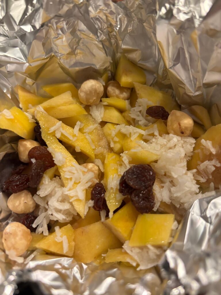 Schil de mango en snijd in stukjes. Meng in een schaal mango, kokos, kaneel, hazelnoten, rozijnen en honing. Verdeel het mengsel in een paar porties. Doe dat iedere portie in een stukje aluminiumfolie en vouw het tot een pakketje. Leg de pakketjes in een ovenschaal en verwarm in de oven bij 180 graden gedurende 15-20 minuten. Dien het toetje op met optioneel een bolletje ijs.
