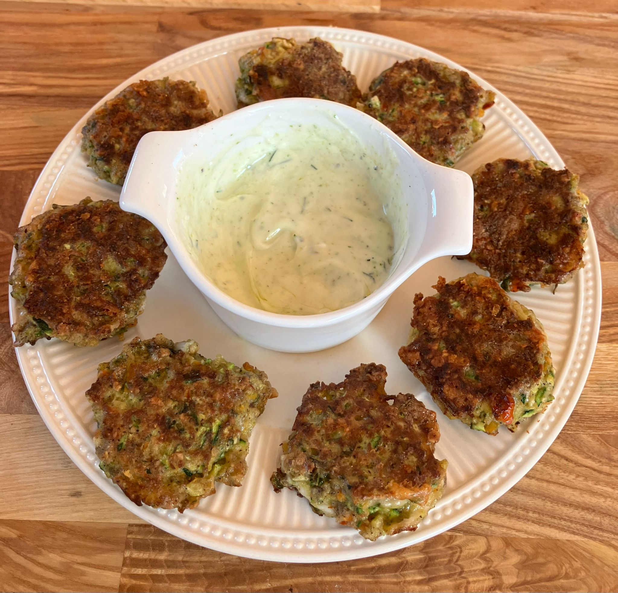 Wortel-courgette koekjes met dille-yoghurtsaus